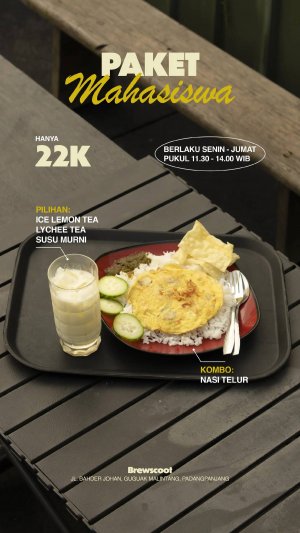 Paket mahasiswa!! Kombo makan nasi telur dan varian minuman ice lemon tea, lychee tea, atau susu murni. Cocok buat perut mahasiswa di tanggal tua.